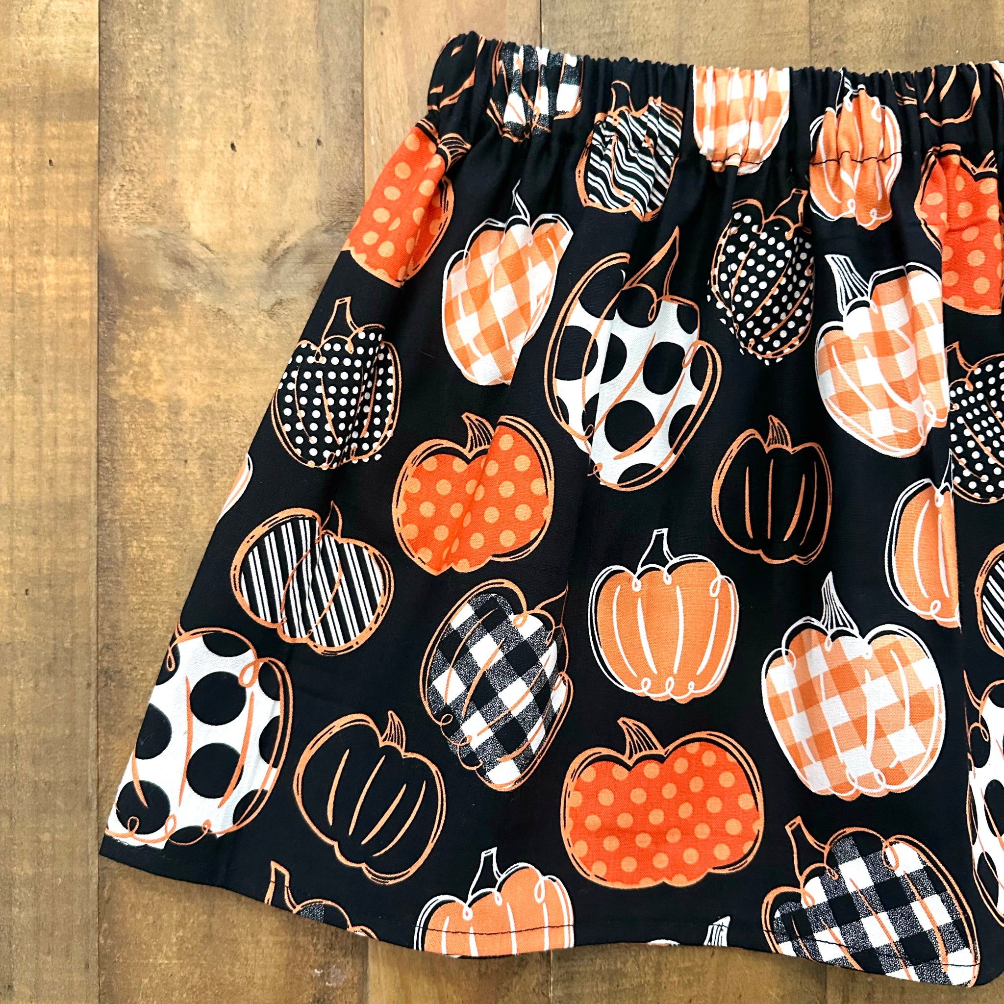 The "Pumpkin Patch" skirt features a playful mix of patterned pumpkins in orange, white, and black. It is perfect for pumpkin patch trips, classroom parties, or trick-or-treat adventures.Pair it with a cozy tee or sweater, tall socks, and the matching bow for the cutest fall look!